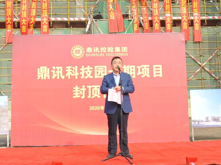 仪式现场,鼎讯控股集团董事长张宗席致辞,张总首先肯定了项目全体人员的工作成果,鼎讯一期项目于2019年7月28日开工奠基,历时173天于今日封顶。自项目开工以来,项目部全体人员以计划为先导,严密策划、科学组织、精心实施,为确保工程如期实现结构封顶的节点目标,付出了极大的努力。张总表示鼎讯科技园一期建设项目是继2005年鼎讯工业园建成之后,鼎讯集团的又一园区建成封顶。张总在讲话的最后明确了一期项目完工时间,勉励大家在未来工作中继续奋斗、克服困难,按时完工。